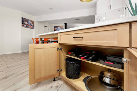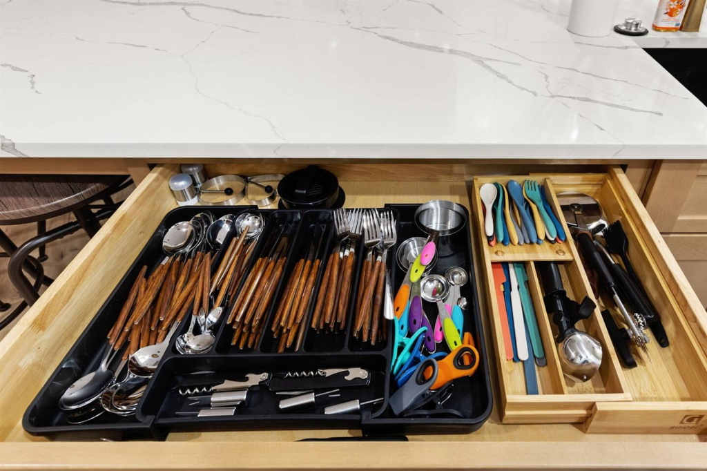 Clean and modern, the open kitchen is a home chef’s dream come true! Fry, steam, and bake all your favorite goodies, then enjoy them at the large dining table. Help yourself to an assortment of cookware and utensils, plus complimentary spices and coffee stored in the drawers. Four high stools at the kitchen island and a cozy window seat make it easy for others to keep the chef company.