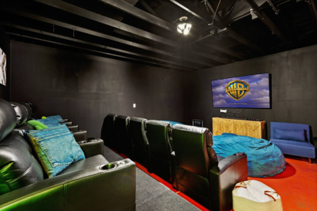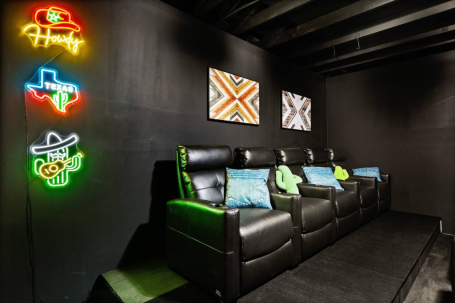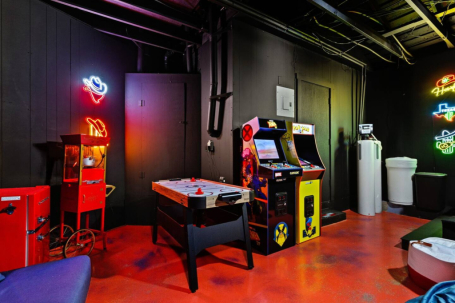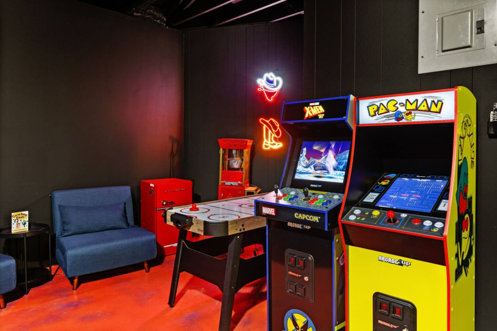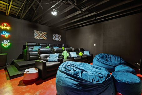 ✹ Theater Room: reclining theater seats, beanbags, popcorn machine, 2 arcade games, air hockey table, Nintendo Switch + 85” smart TV