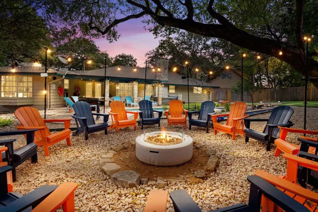 ✔ Fire pit w/ Adirondack chairs + pretty string lights