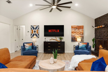 ✹ Open-concept living area w/ indoor fireplace, flat-screen TV + comfy seating